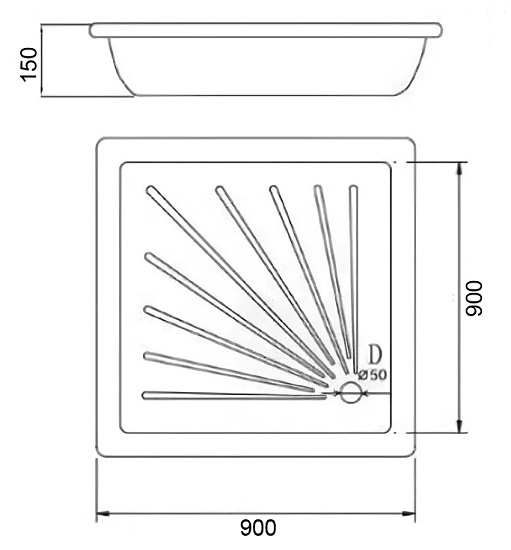 Поддон стальной эмалированный квадрат 90х90х15, слив D50 мм # LORANTO