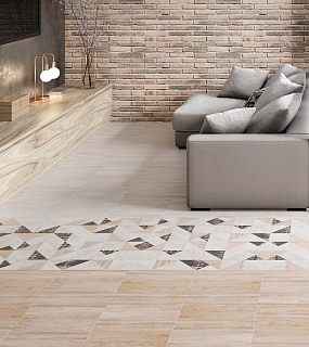Современное звучание основной плитке добавляет стильный геометричный декор, который смотрится стильно и нестандартно за счет своих различных цветов, текстур, оттенков и размеров, а также неоднородных направлений волокон в древесном узоре.